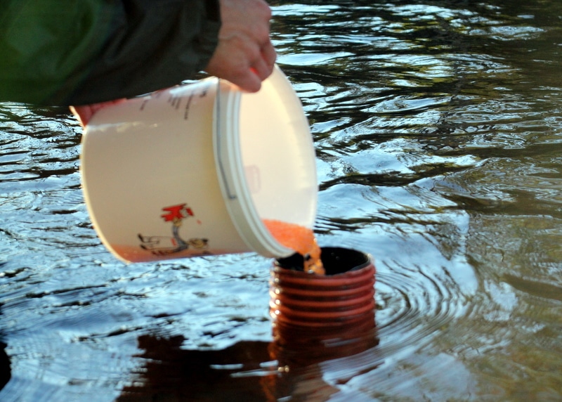 Man fyller grus rundt og opp langs det negravde røret. Når den på forhånd befruktede rognen har sunket på plass, løfter man røret forsiktig opp og grusen pakker seg gjevnt over og beskytter frem mot klekking utpå våren.