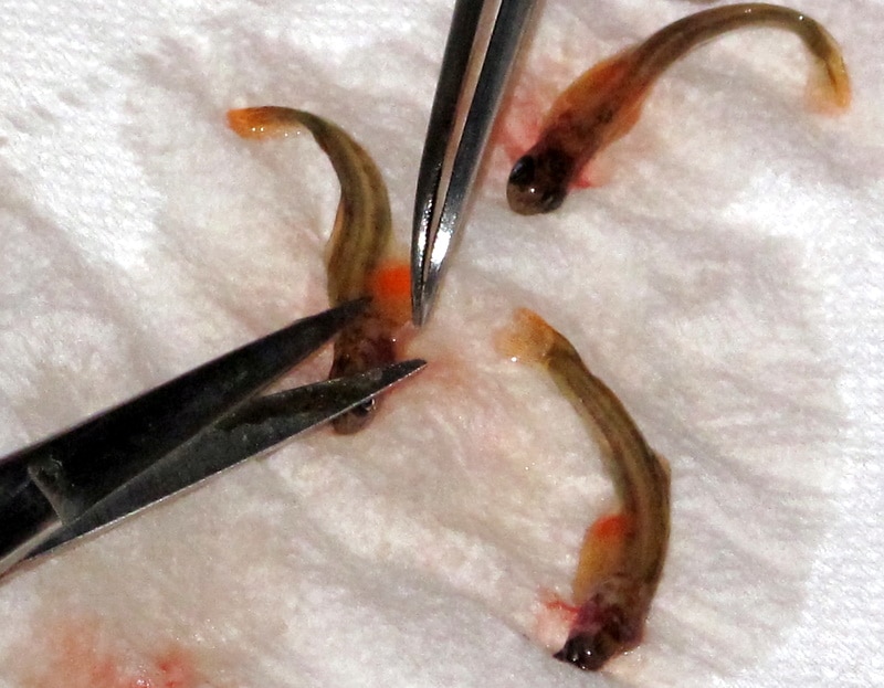Yngelen avlives og brystfinner klippes av og blir studert nøye i mikroskop.